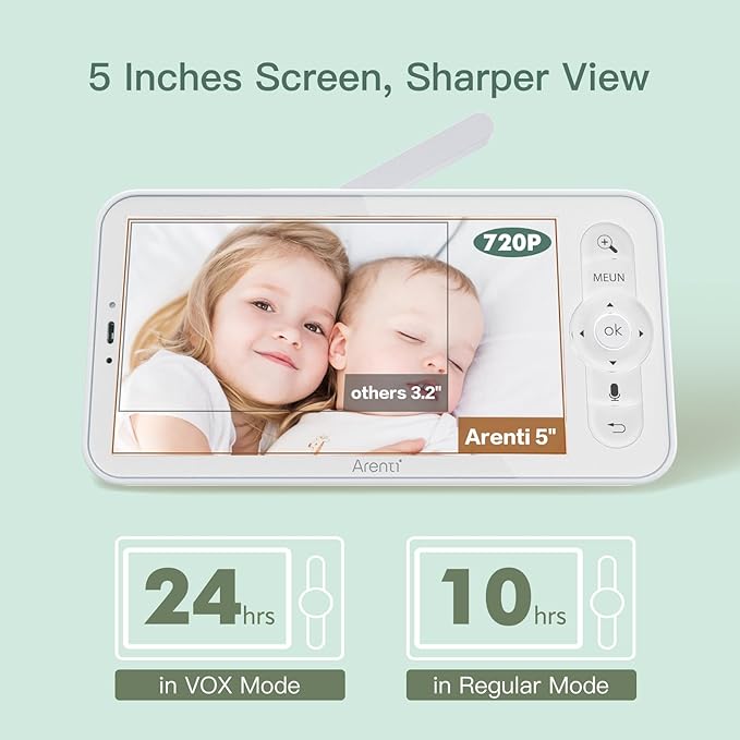 - شاشة LCD كبيرة HD مقاس 5 انش: يوفر جهاز مراقبة الأطفال هذا المزود بشاشة LCD كبيرة HD عالية الجودة مقاس 5 انش فيديو وصوت واضح في الوقت الفعلي لطفلك